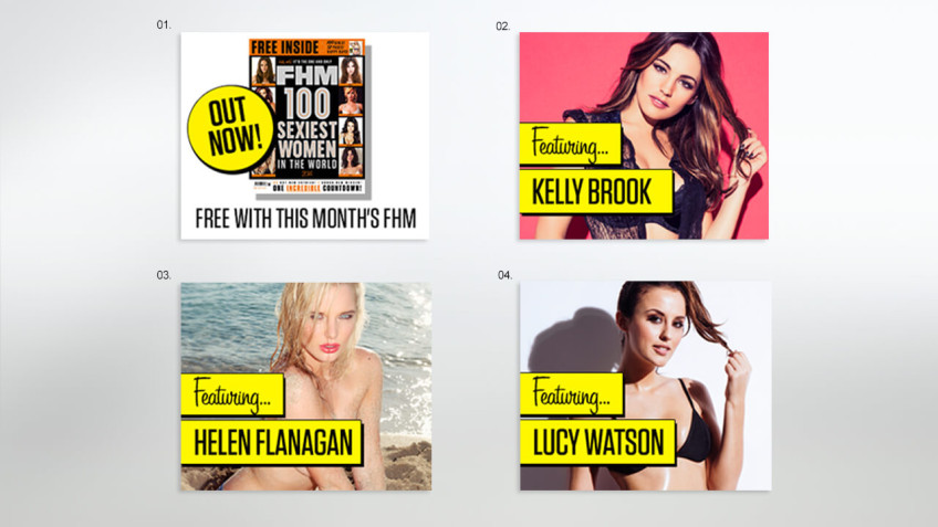 The notorious FHM 100 sexiest is an annual event hosted in London. It celebrates the top 100 sexiest women that year voted by the readers of the magazine. Last year I was assigned the task to design all the digital ads for the online entry of the votes and the release of the issue with the results. This included flash ads, HPTO, animated Gifs and email newsletter.